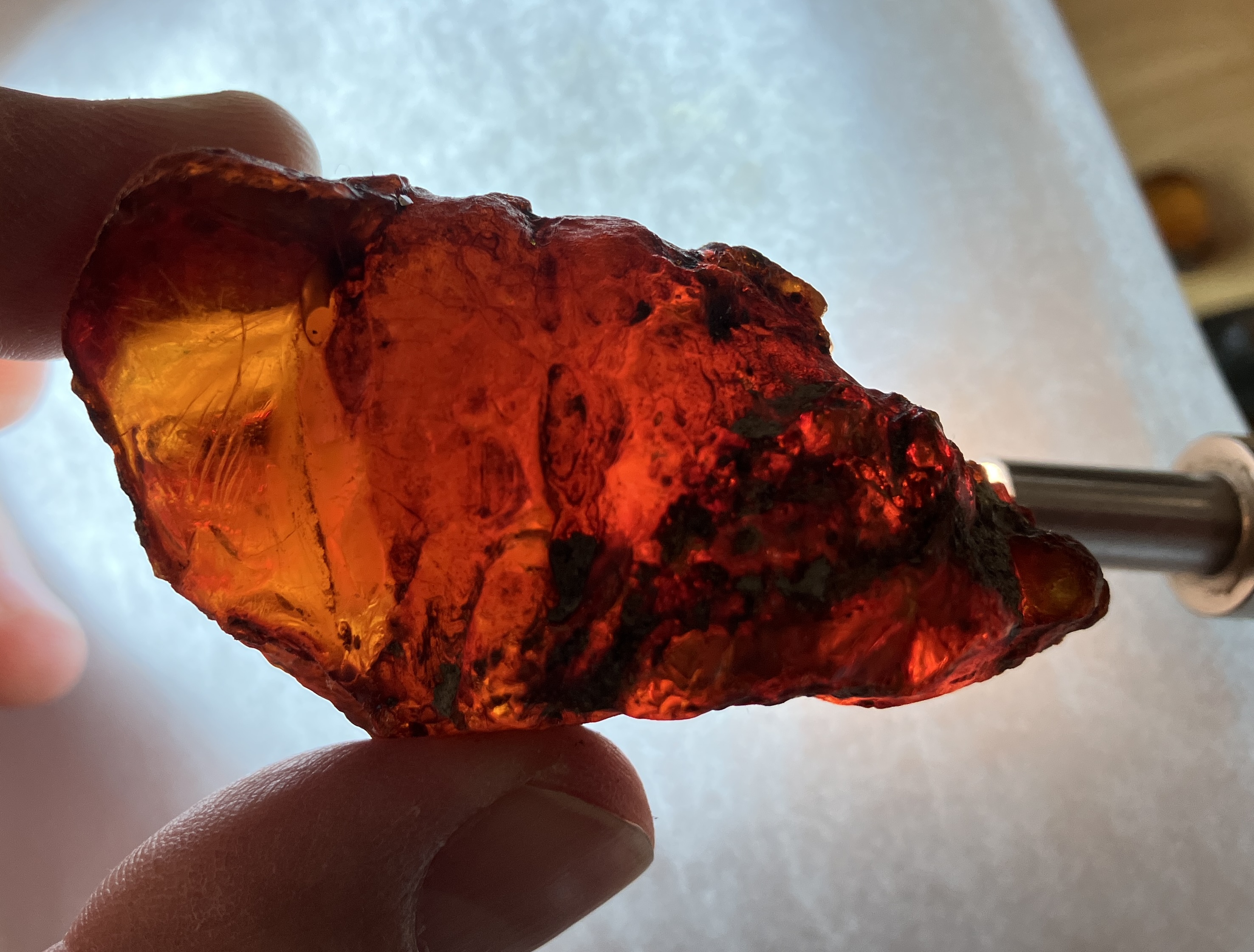 Dominican Amber In the Dominican Republic, Hymenaea trees are called Algorrobo. The Hymenaea tree exudes vast amounts of resin which over millions of years of pressure hardens into amber. Generally amber is found because a landslide along a steep slope in the mountains exposes veins of black lignite. If the lignite contains amber it is gradually extracted by digging along the vein with picks and shovels. After the amber is found it is chiseled by hand out of the shaft walls, put into burlap sacks and passed out of the mine where it is separated from the rock by machete. Larger chunks of amber make it possible to view inclusions almost immediately by holding the amber up to sunlight to determine if a large inclusion has been discovered. Fossil bearing amber is polished locally. |