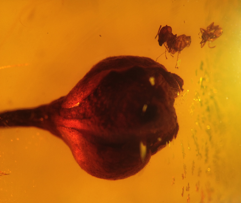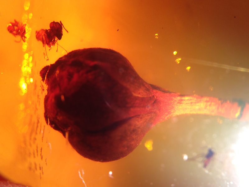 an giant stemmed flower bud along with 2 ants with fat mandibles and a small gall gnat
