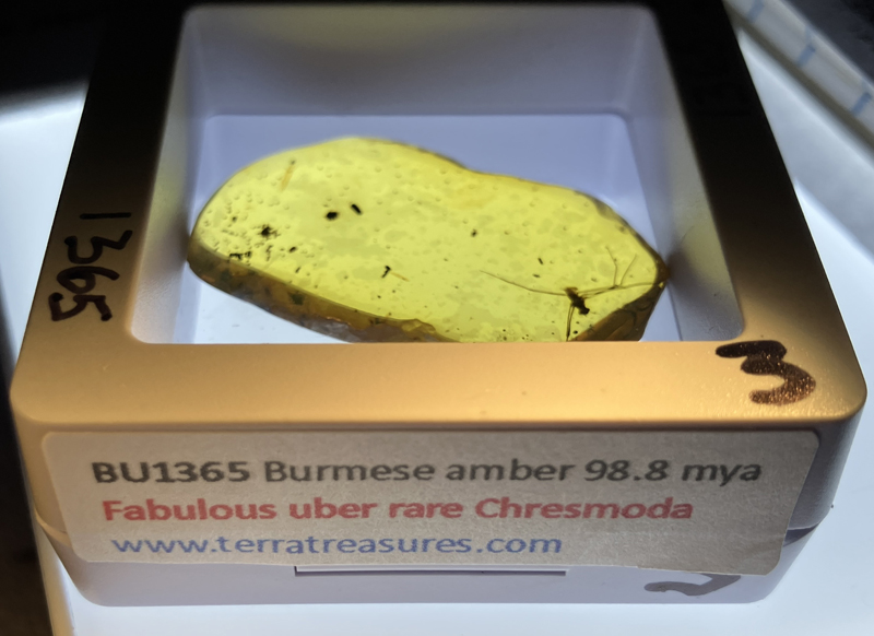 We have donated many hundreds of amber specimens to museums in the United States and have several dozen new species of insects in amber named after us. We have examined several thousand specimens of rough Burmese amber and have prepped many new Burmese fossil amber specimens. We have traveled to Europe with colleagues to examine unusual spectacular Dominican Amber specimens in private collections and we consider the amber curators of the museums in Santo Domingo, Puerto Plata and New York City our friends. Exploring for and collecting amber along with the examination and research of amber is our passion.