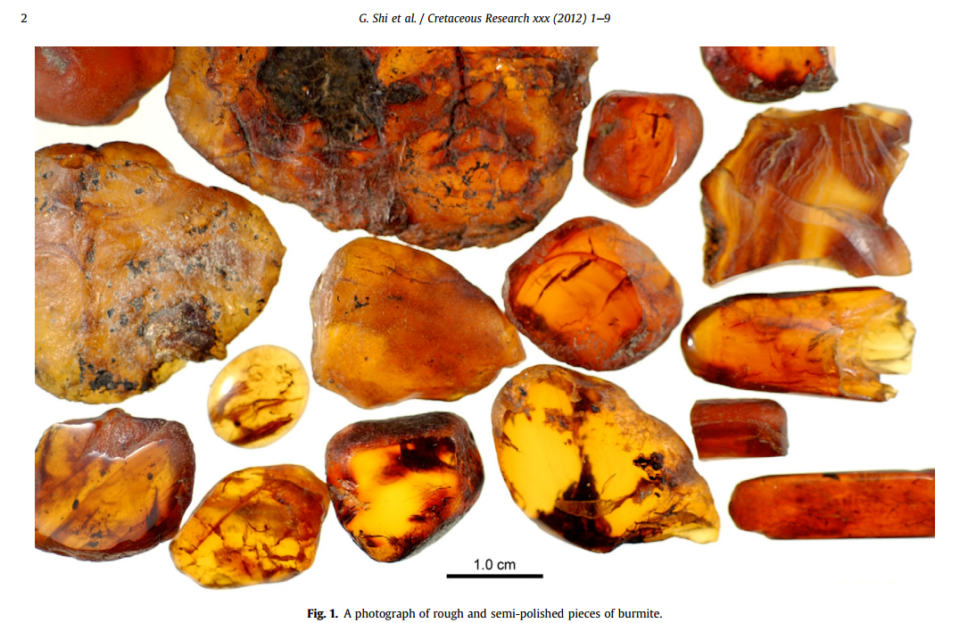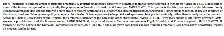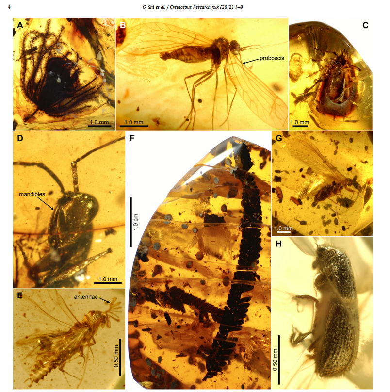 | Shi, Grimaldi et al "Amber from northern Myanmar has been commercially exploited for millennia, and it also preserves the most diverse palaeobiota among the worlds’ seven major deposits of Cretaceous amber. Recent estimated ages vary from Albian to Cenomanian, based on palynology, an ammonoid, and Mesozoic insect taxa preserved within the amber. The burmite-bearing rock is sedimentary and consists mainly of rounded lithic clasts (0.03 w 0.15 mm in diameter), with minor fragments of quartz and feldspar. Among the lithic clasts are mostly volcanic rocks. Amber from northern Myanmar, called Burmese amber or merely “burmite”, is the only Cretaceous amber deposit in the world that is exploited commercially, as well as the first to have been studied scientifically. The history of its use has been reviewed by Zherikhin and Ross (2000), Grimaldi et al. (2002), Cruickshank and Ko (2003), and Ross et al. (2010). Briefly, burmite had been used primarily in carvings for at least two millennia by Chinese people, for which the material is ideally suited (Grimaldi, 1996). The deposits in the Kachin state, northern Myanmar, are productive (an estimated 83 tons were exported between 1898 and 1940), and some amber pieces are very large (the largest is 15 kg, in the Natural History Museum, London). Moreover, colours vary from a transparent yellow to a highly desirable deep red (Figs. 1e3), theamber resists fracturing and is relatively hard (1.2 times harder than Baltic amber), and it receives a glassy polish. Burmite mining lapsed from just before the independence of Burma from Britain in 1947, and did not resume until the late 1990s. The greatest value of burmite, however, is scientific. Amber in general preserves biological inclusions with microscopic fidelity, so as a mode of fossilization it is unparallelled for phylogenetic and palaeontological studies of Cenozoic and late Mesozoic terrestrial life forms (Grimaldi and Engel, 2005). Amber from the Cretaceous is further significant since it coincides with the radiation of the angiosperms and major tectonic shifts in continental positions, and precedes the famous end-Cretaceous impact event. Of the seven major deposits of amber from the Cretaceous Period (Table 1), Burmese amber contains probably the most diverse palaeobiota. For example, approximately 228 families of organisms (primarily arthropods) have been reported from burmite, compared to a range of 68e125 families recorded thus far in the other six major amber deposits. Only the much larger, commercially exploited deposits from the Miocene of the Dominican Republic and Mexico, and the Eocene Baltic amber have yielded more families and species. Interestingly, burmite contains an exceptional diversity and abundance of the most diverse order of insects, the Coleoptera (16% of all studied inclusions, representing more than 40 families, vs. 2e8% and around a dozen families in the other Cretaceous ambers). Among the more significant records of organisms in burmite is the only Mesozoic fossil of the phylum Onycophora (“velvet worms”) (Grimaldi et al., 2002), as well as the oldest definitive Mesozoic records of mosquitoes, family Culicidae (Borkent and Grimaldi, 2004), and the insect orders Embiodea (Engel and Grimaldi, 2006), Strepsiptera (Grimaldi et al., 2005a, b), and Zoraptera (Engel and Grimaldi, 2002) (Fig. 4). Oddly, burmite also preserves the youngest records of several archaic insect groups, notably Postopsyllidium of the hemipteran family Protopsyllidiidae (previously known from the PermianeJurassic) (Grimaldi, 2003), and Parapolycentropus, of the scorpionfly family Pseudopolycentropodidae (TriassiceBarremian) (Grimaldi et al., 2005a) (Fig. 4). Parapolycentropus is remarkable for the loss of the hind wings, specialized antennae, and long, styletiform proboscis, convergently resembling a mosquito. Burmite also preserves early, primitive species in groups that are highly social today, notably Formicidae (ants) and Isoptera (termites) (Engel and Grimaldi, 2005; Engel et al., 2007). One of these presumably social insects is Haidomyrmex (Dlussky, 1996), arguably the most peculiar ant known (Fig. 4).