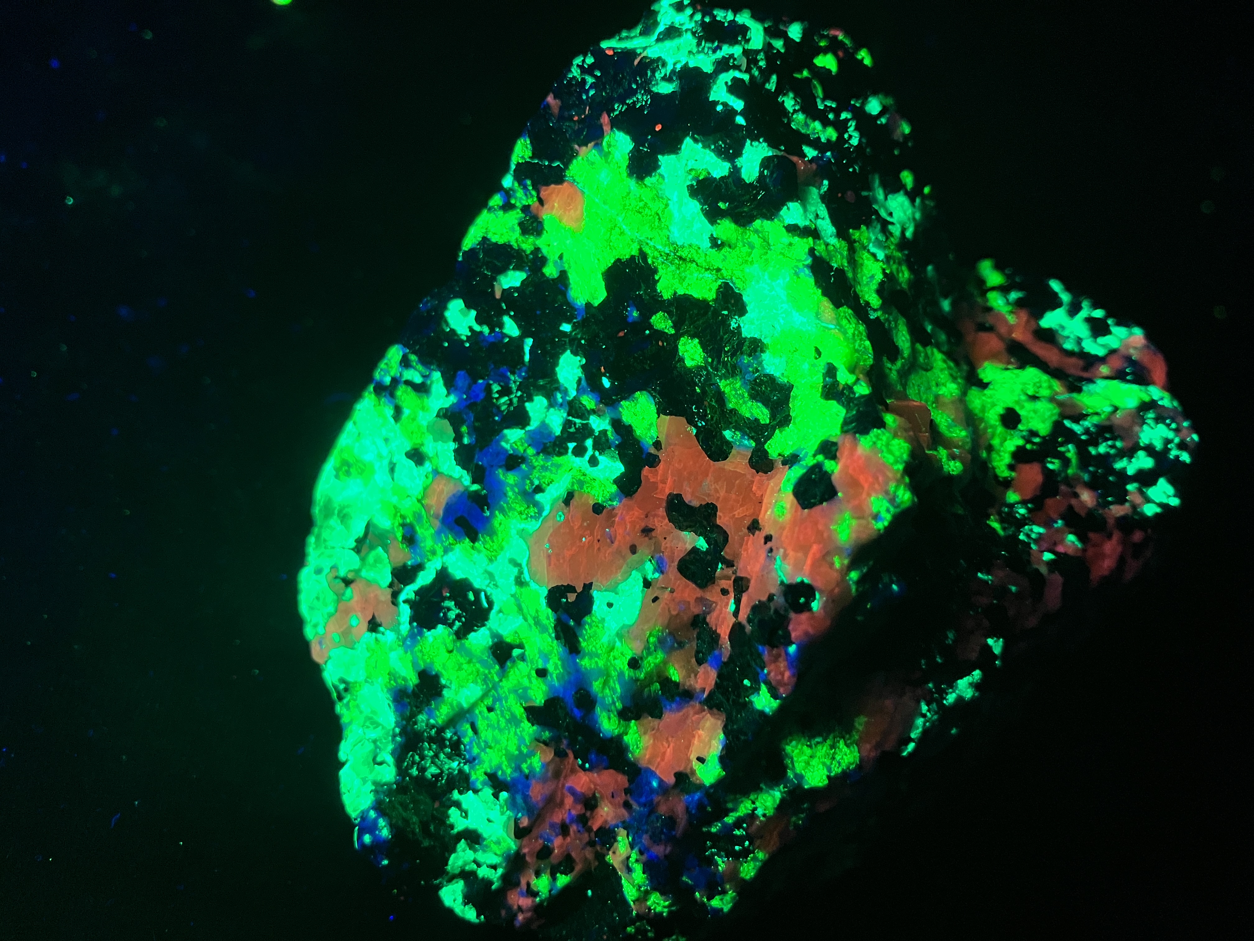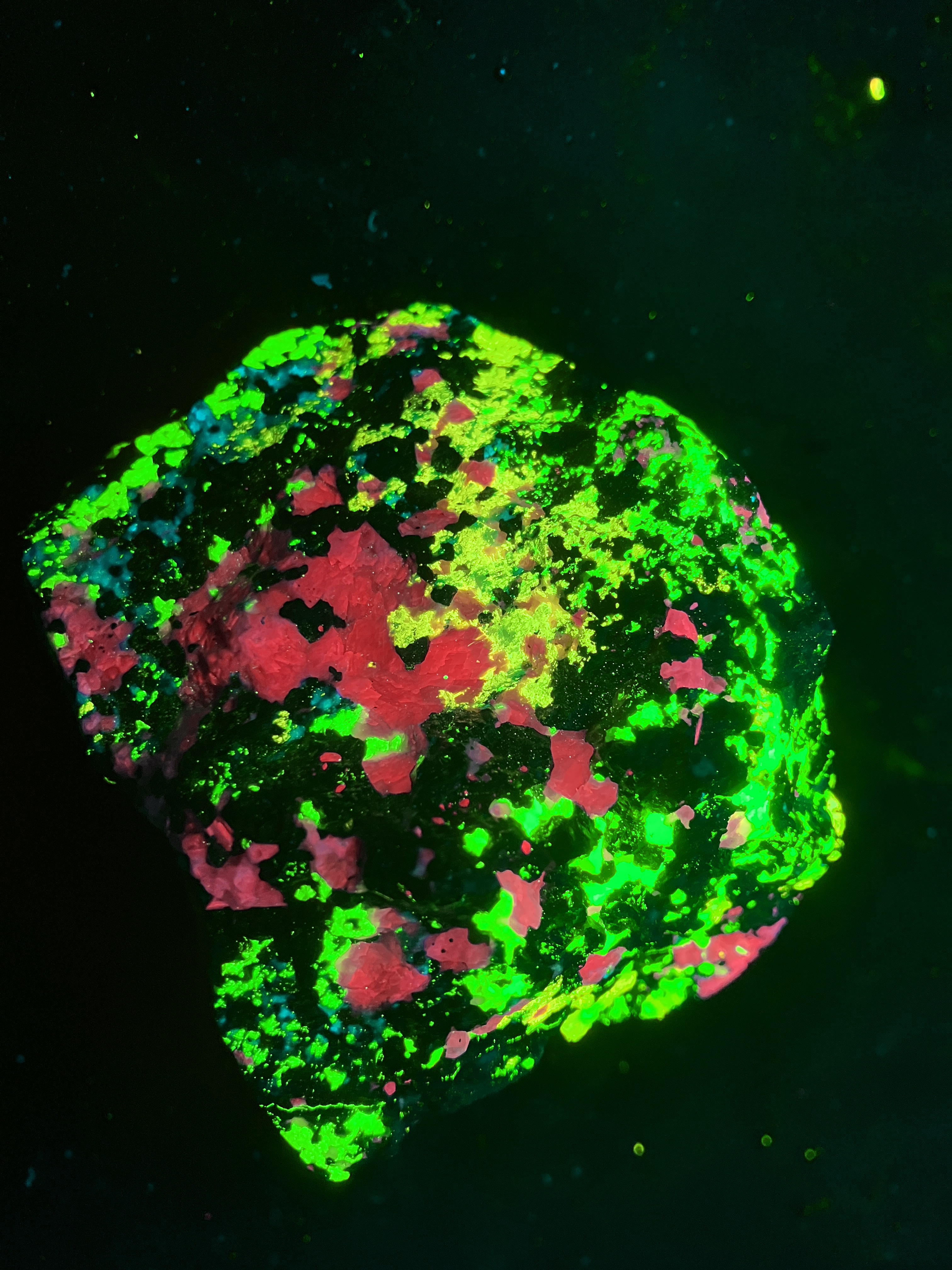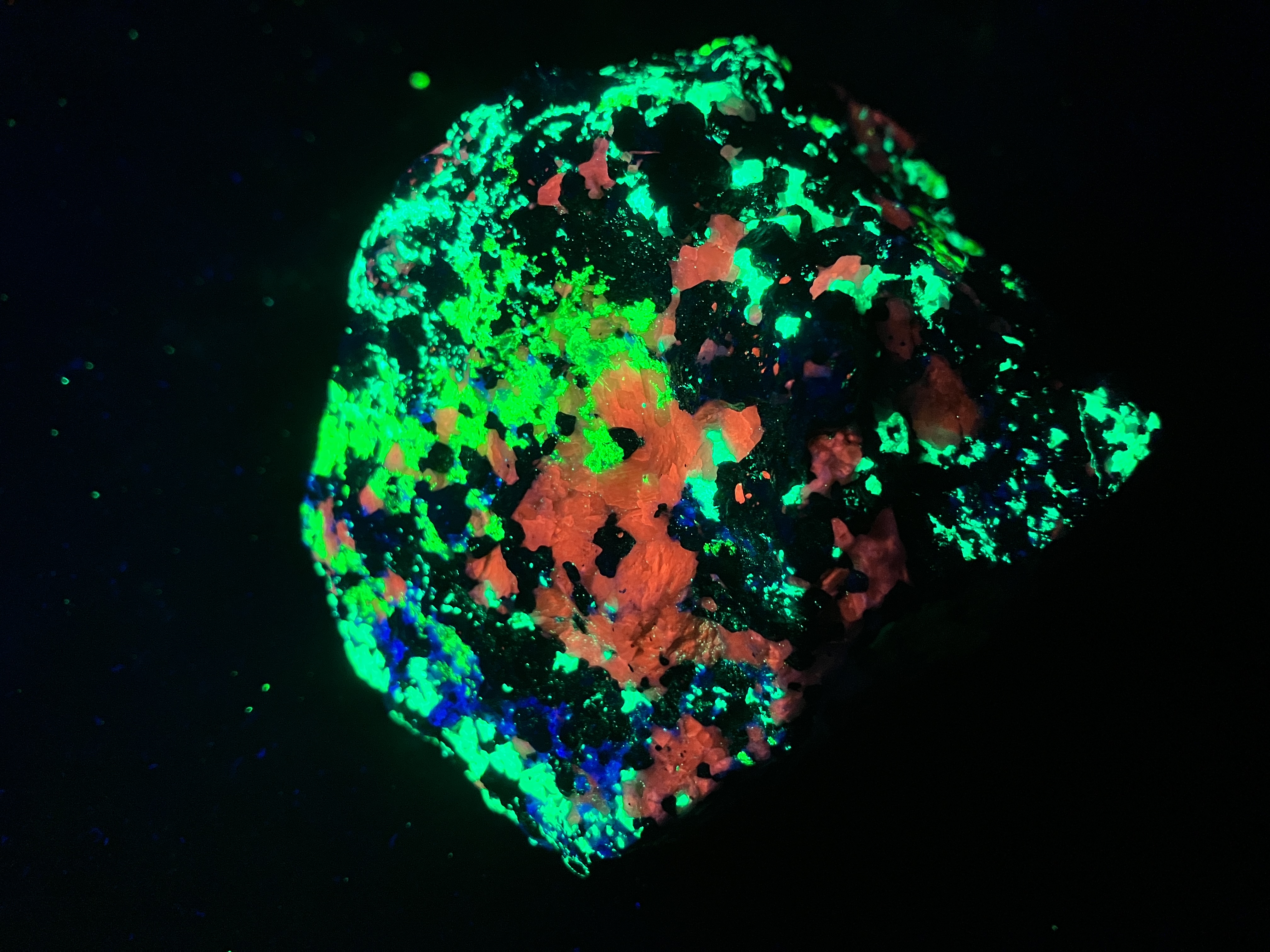 Shortwave UV light: Bright pale blue, often with red zones, less often with white and pink zones Mid wave UV light: Moderately bright red, orange Longwave UV light: Weak red, orange References: Dunn, Pete J. (1995). Franklin and Sterling Hill New Jersey: the world's most magnificent mineral deposits. Franklin, NJ.: The Franklin-Ogdensburg Mineralogical Society. p.499