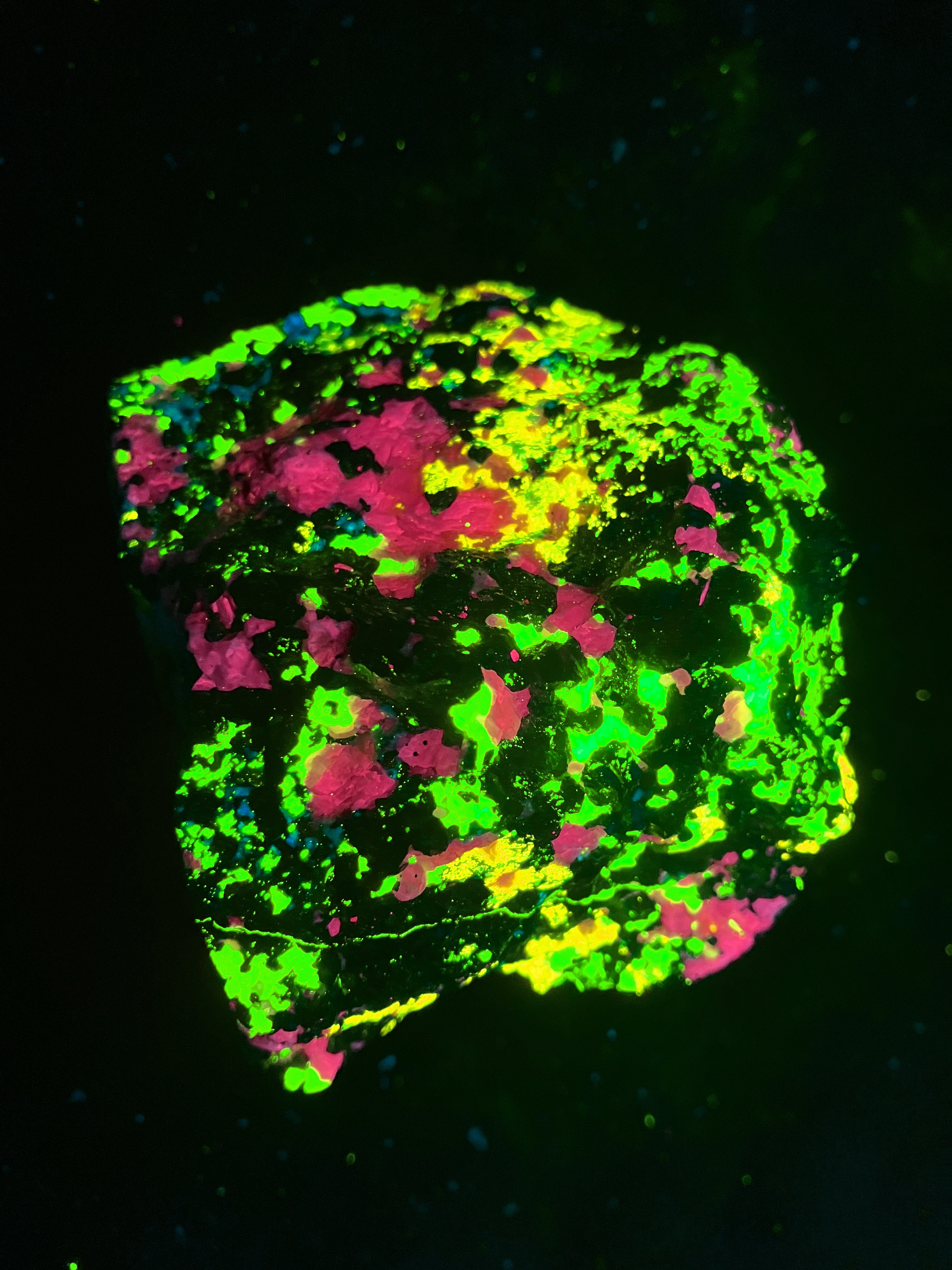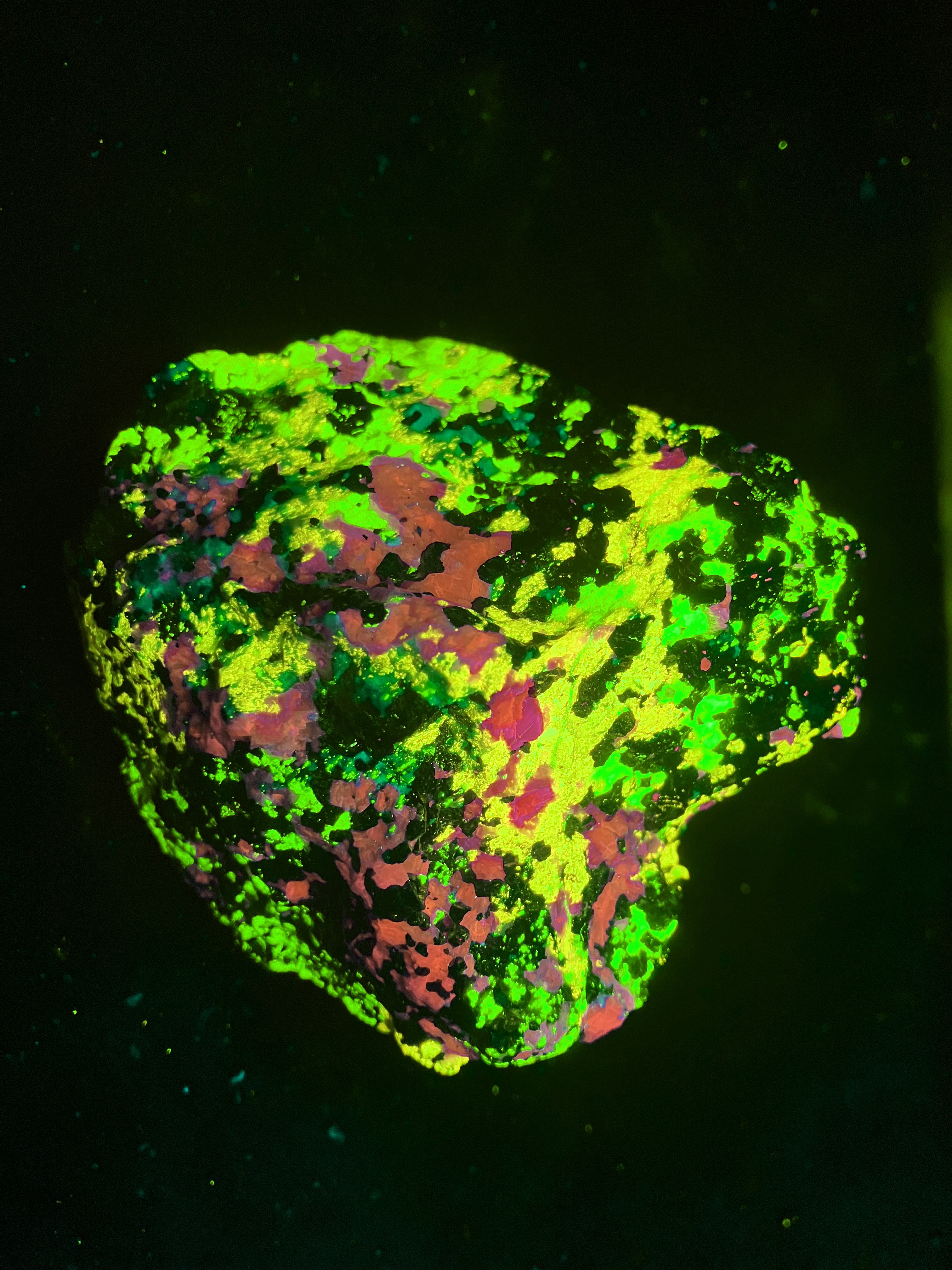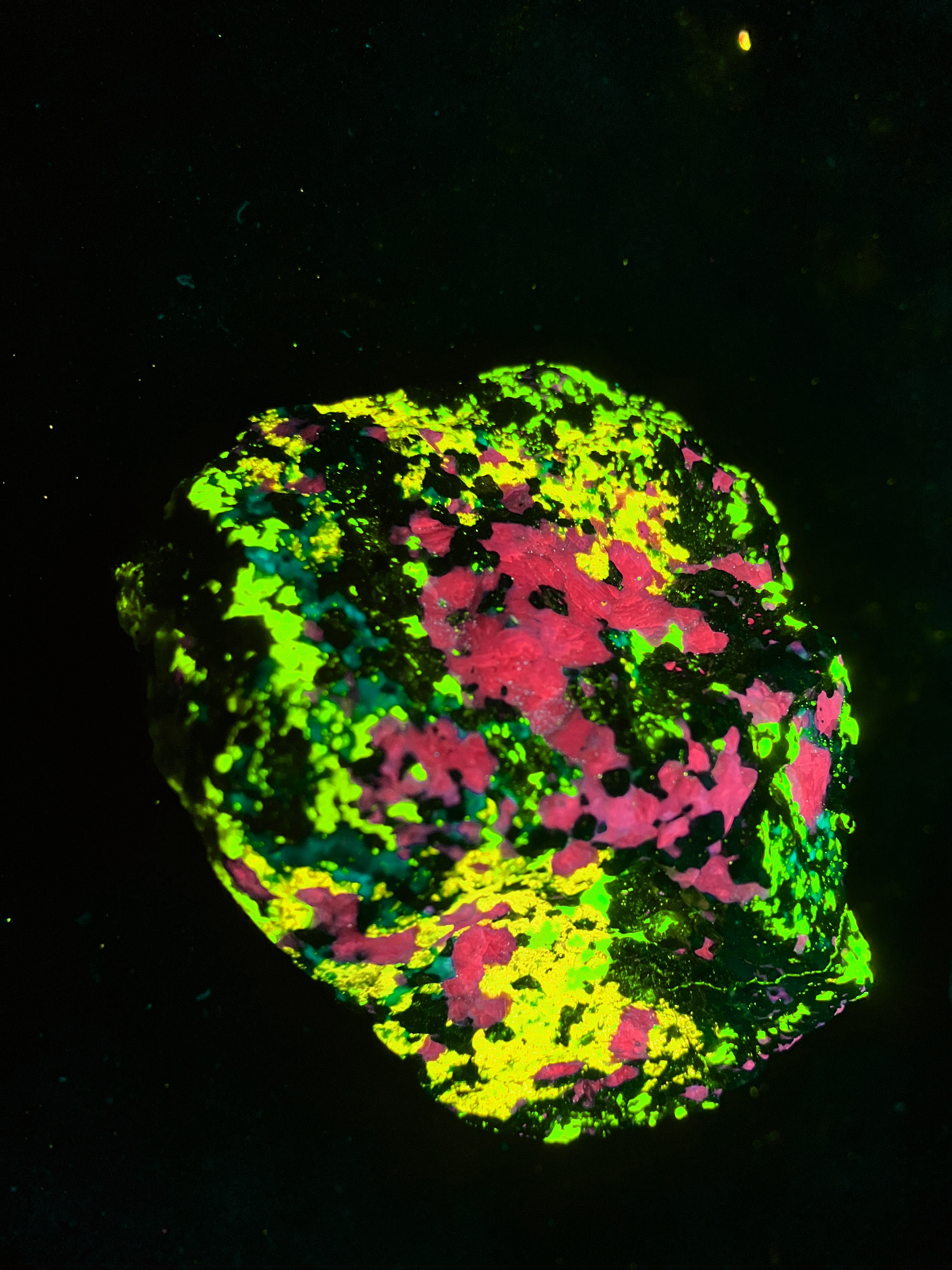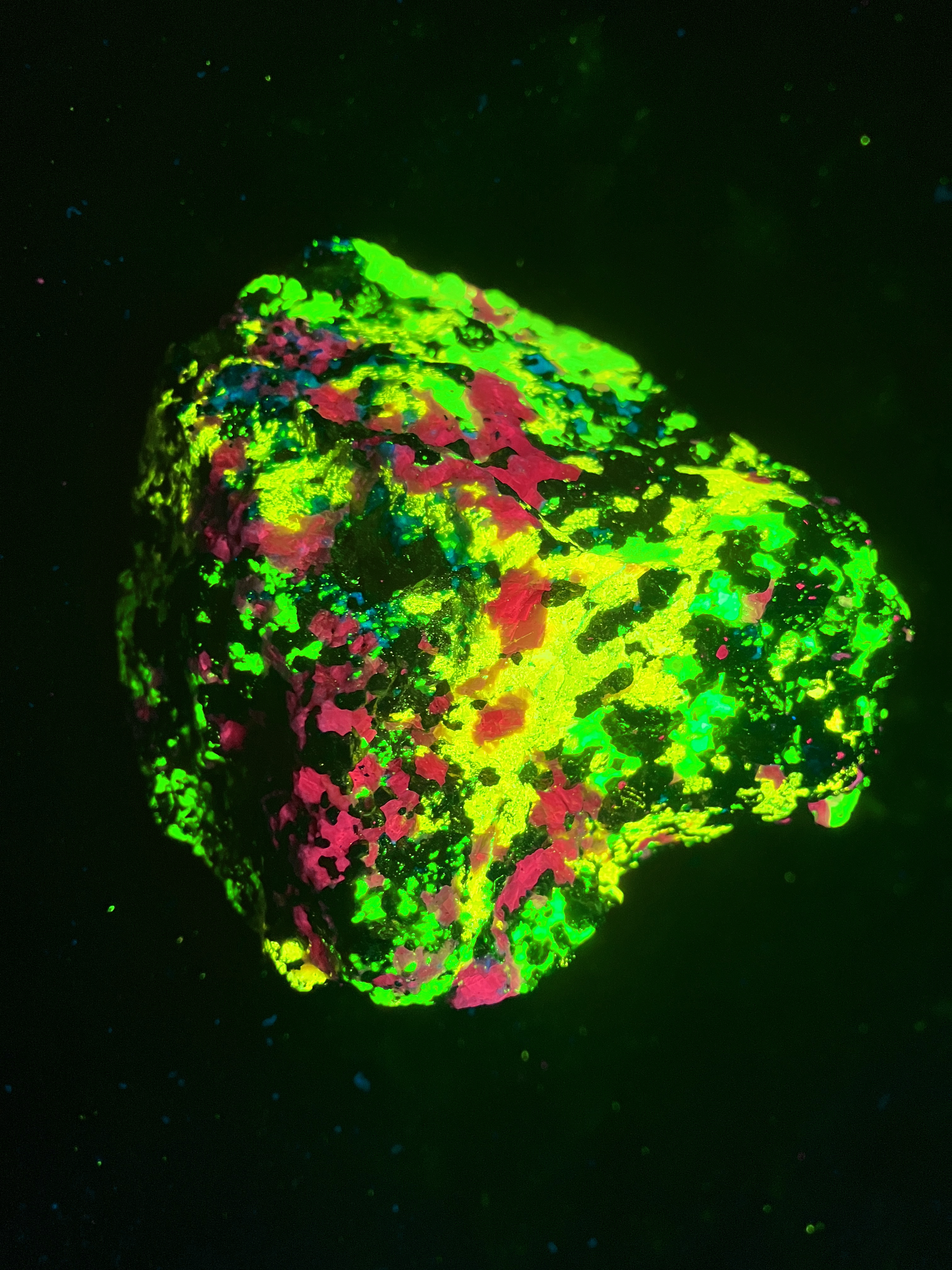 Shortwave UV light: Bright pale blue, often with red zones, less often with white and pink zones Mid wave UV light: Moderately bright red, orange Longwave UV light: Weak red, orange References: Dunn, Pete J. (1995). Franklin and Sterling Hill New Jersey: the world's most magnificent mineral deposits. Franklin, NJ.: The Franklin-Ogdensburg Mineralogical Society. p.499