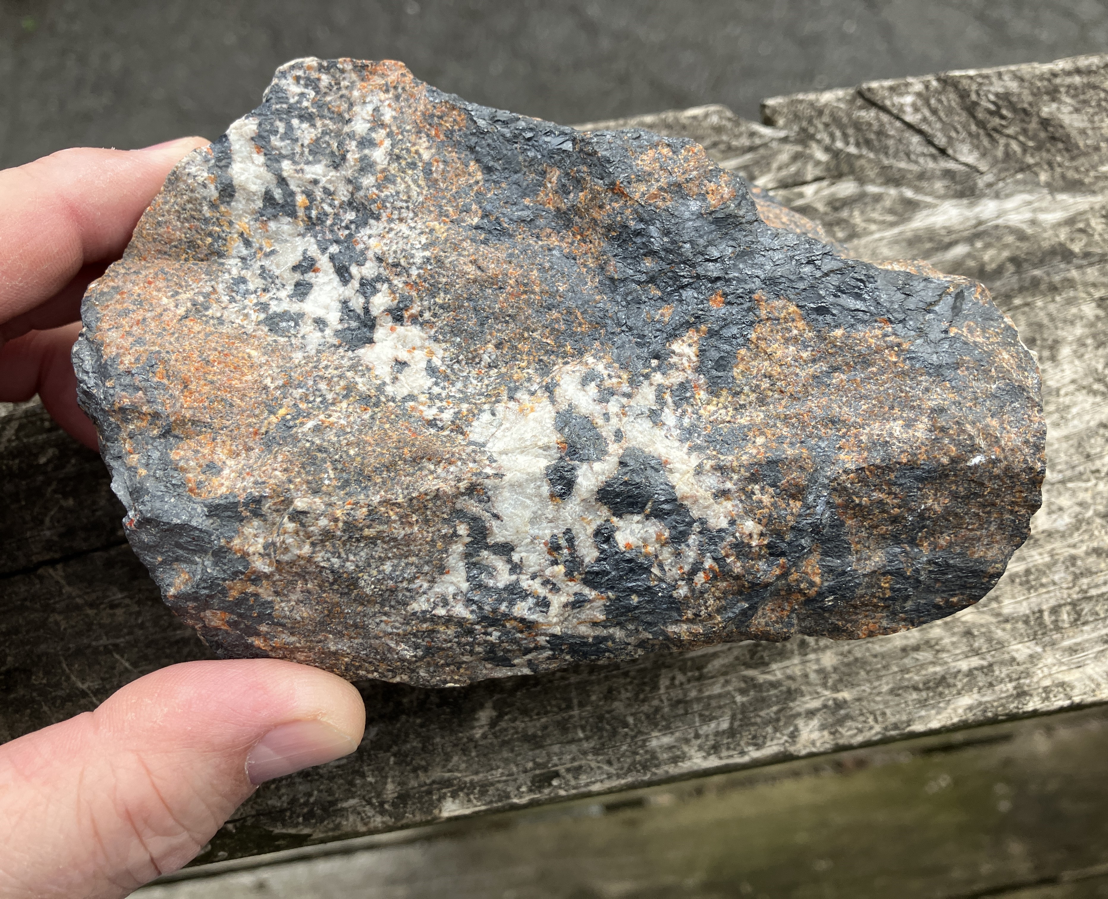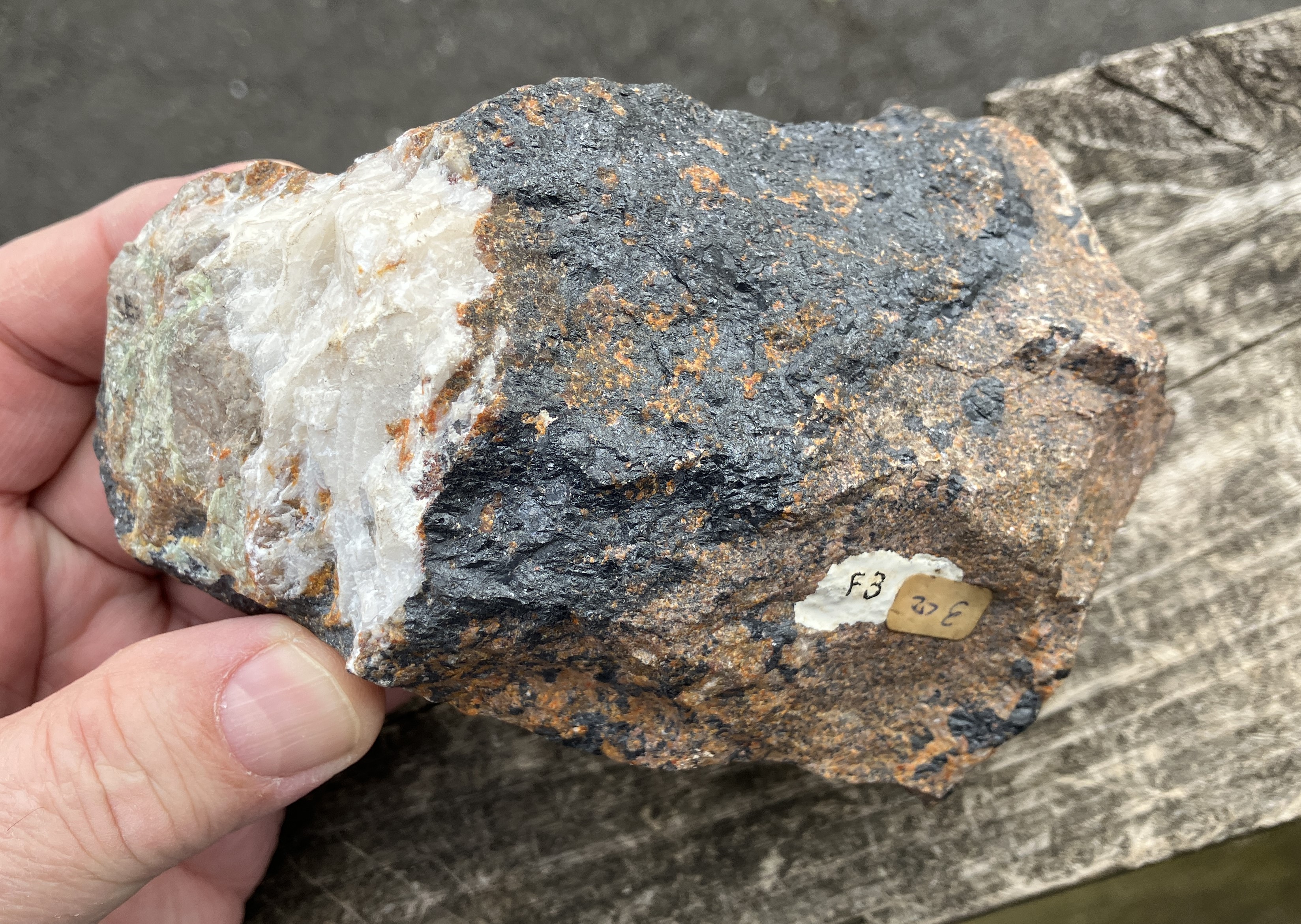 The historical lore of the Mill Site Dump is that the final approach to the Palmer #2 Mill (built in 1898) was over a trestle about 8-12 meters from the rails to ground level. Allegedly, the trestle shifted and was perceived as unstable and management ordered a rapid dumping of rock to bring the fill level up to the railroad tracks and thus avert a long term mill shutdown. Lore further suggests that the ore picking table in the Mill was reversed so that any rock in the Mill was diverted back to the trestle supports. Further shipments of blasted rock of all kinds, both dump-grade and ore-grade, were taken from the Parker Shaft and elsewhere to fill the entire depression up to track level. The presence of margarosanite, hardystonite, and other desirable species that have been recovered from Mill Site rock supports the folklore."