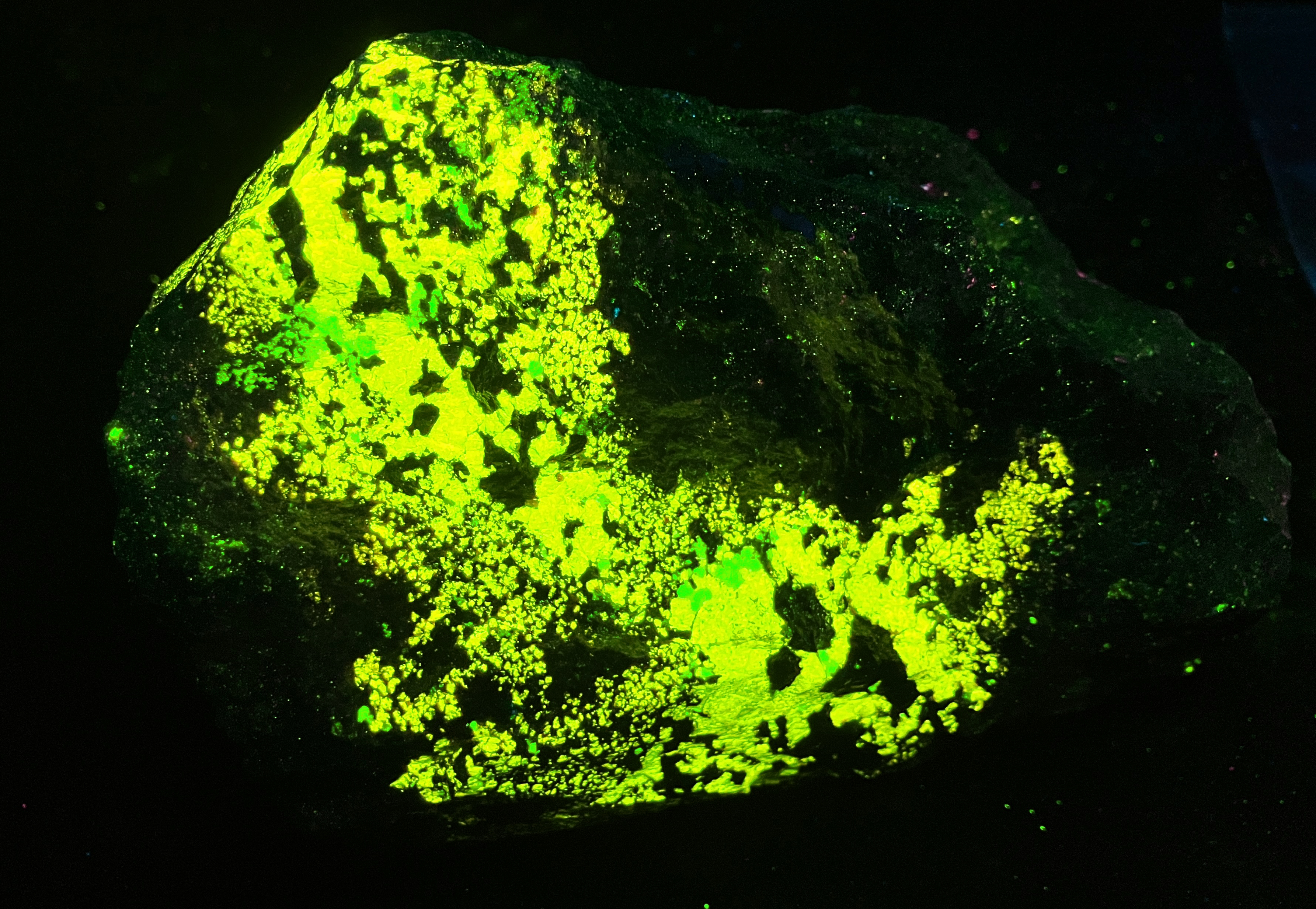 Shortwave UV light: Bright pale blue, often with red zones, less often with white and pink zones Mid wave UV light: Moderately bright red, orange Longwave UV light: Weak red, orange References: Dunn, Pete J. (1995). Franklin and Sterling Hill New Jersey: the world's most magnificent mineral deposits. Franklin, NJ.: The Franklin-Ogdensburg Mineralogical Society. p.499