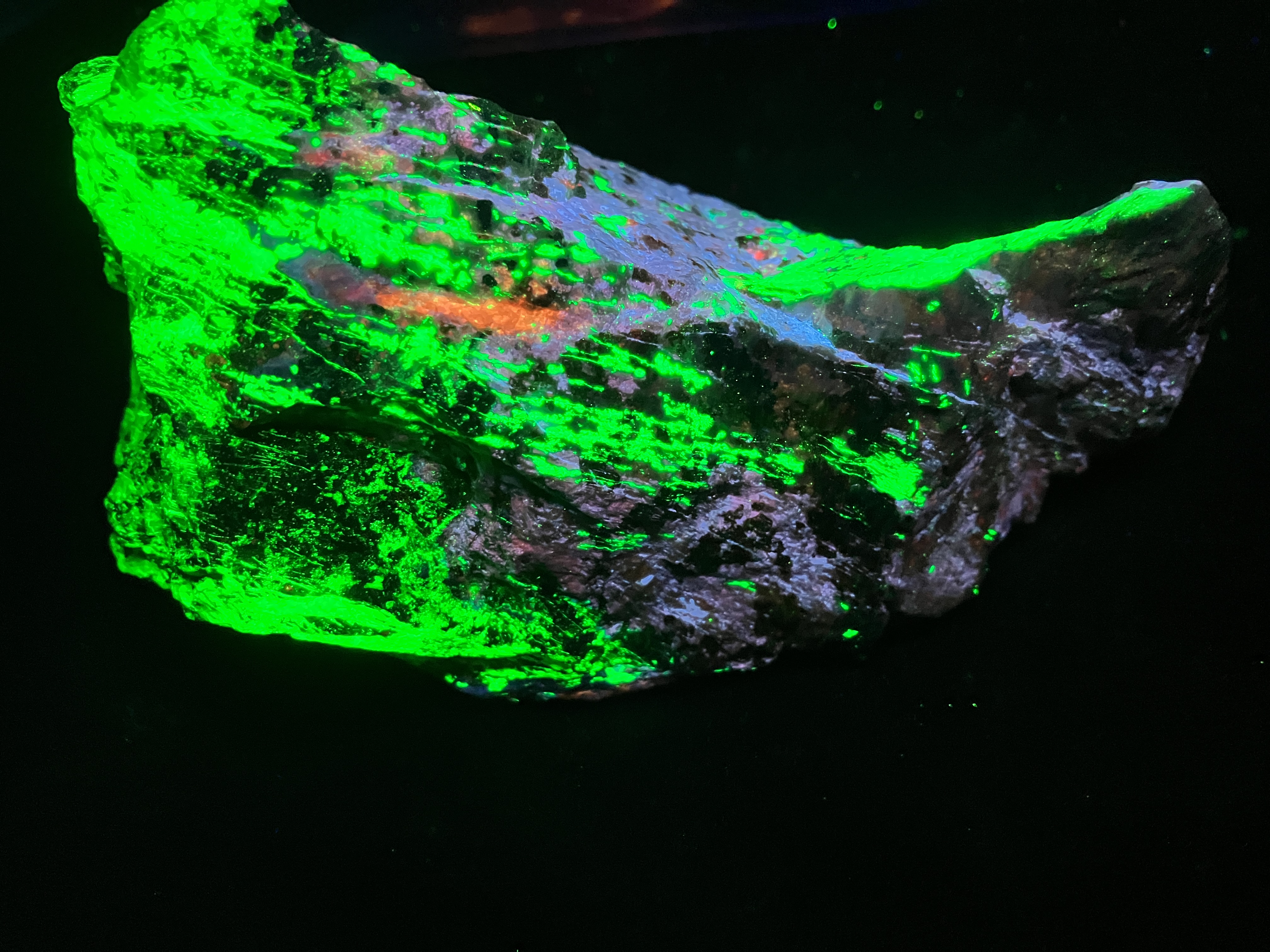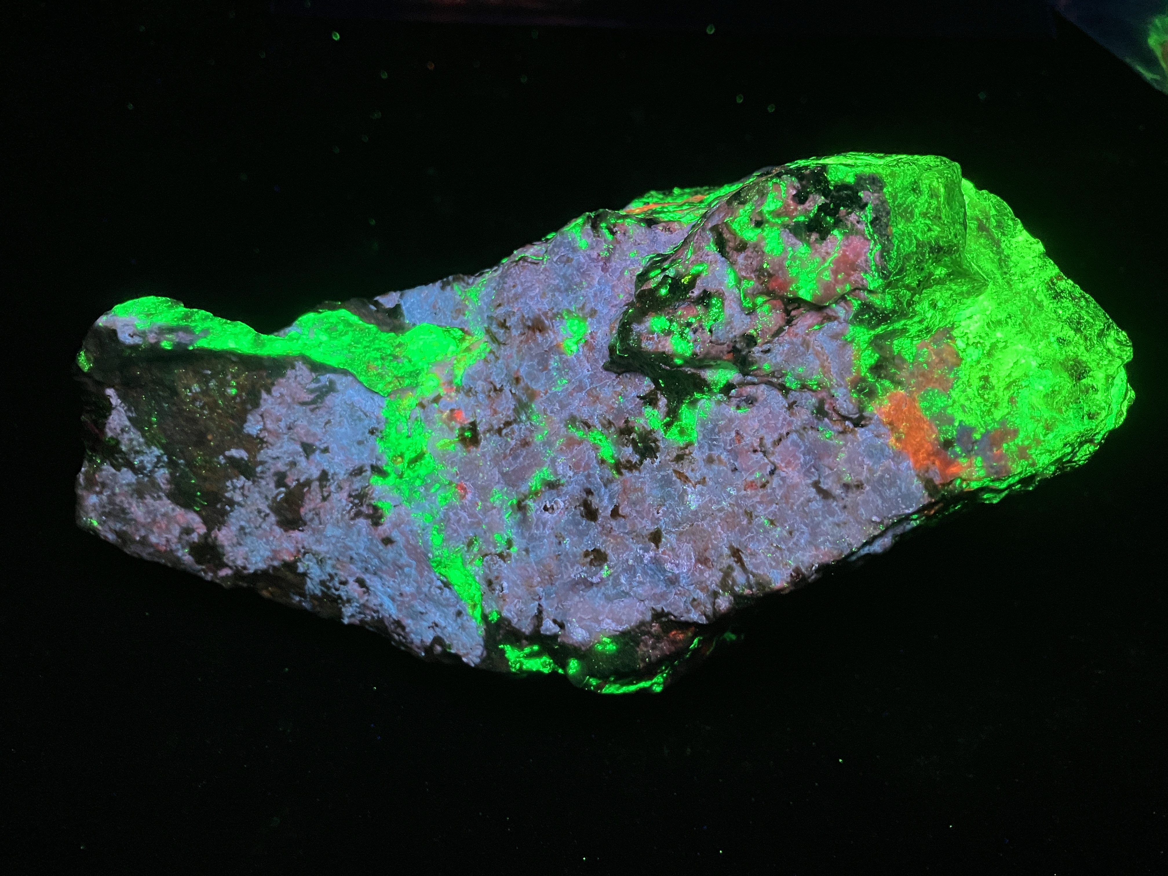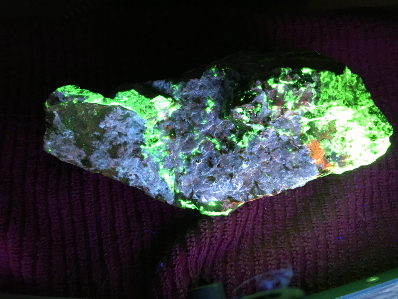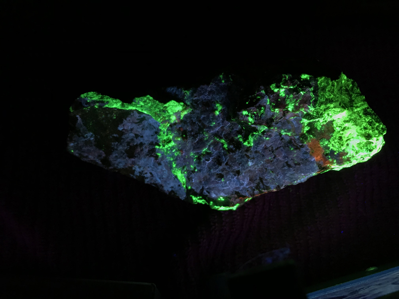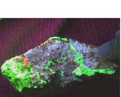 Shortwave UV light: Bright pale blue, often with red zones, less often with white and pink zones Mid wave UV light: Moderately bright red, orange Longwave UV light: Weak red, orange References: Dunn, Pete J. (1995). Franklin and Sterling Hill New Jersey: the world's most magnificent mineral deposits. Franklin, NJ.: The Franklin-Ogdensburg Mineralogical Society. p.499