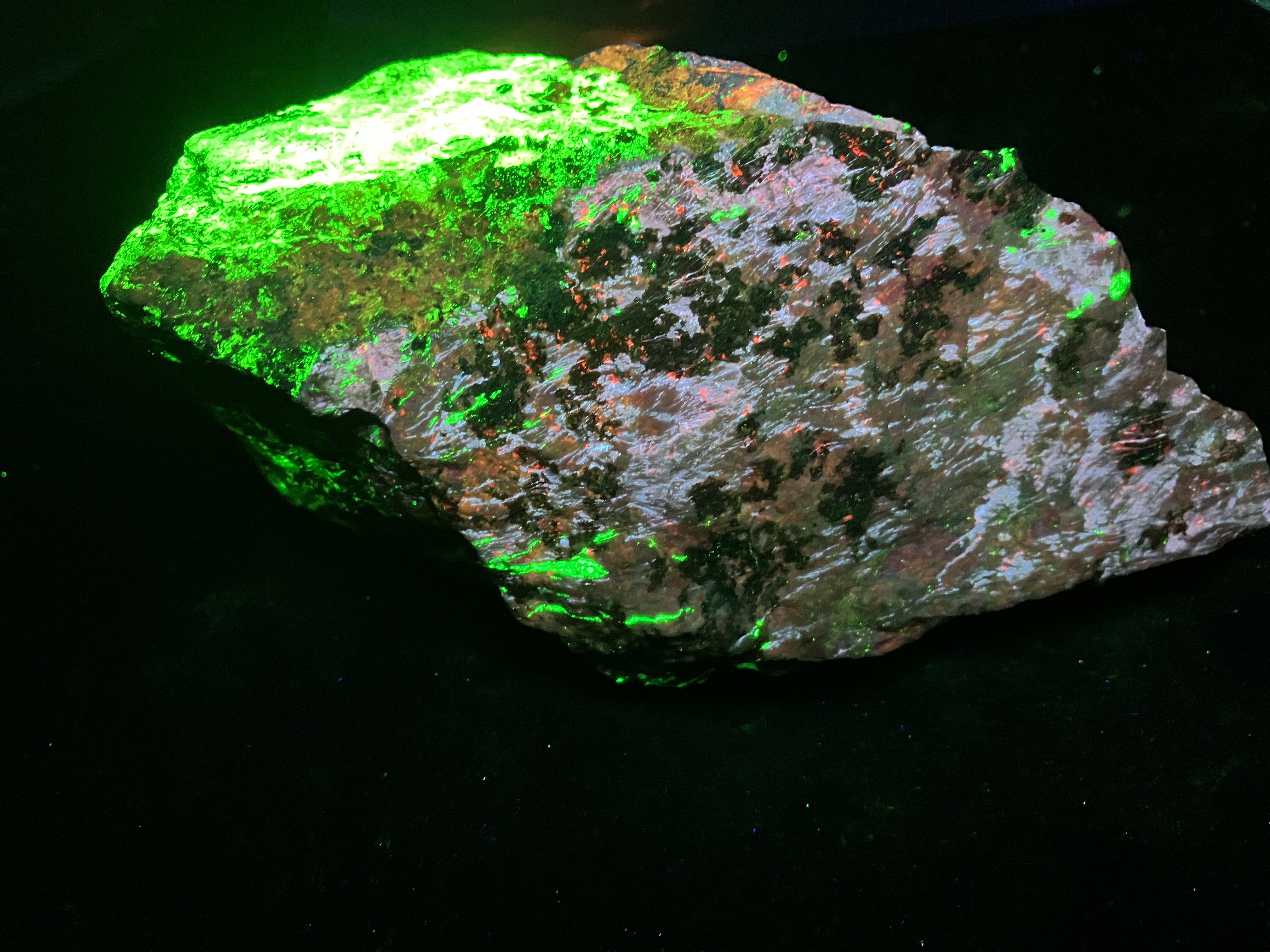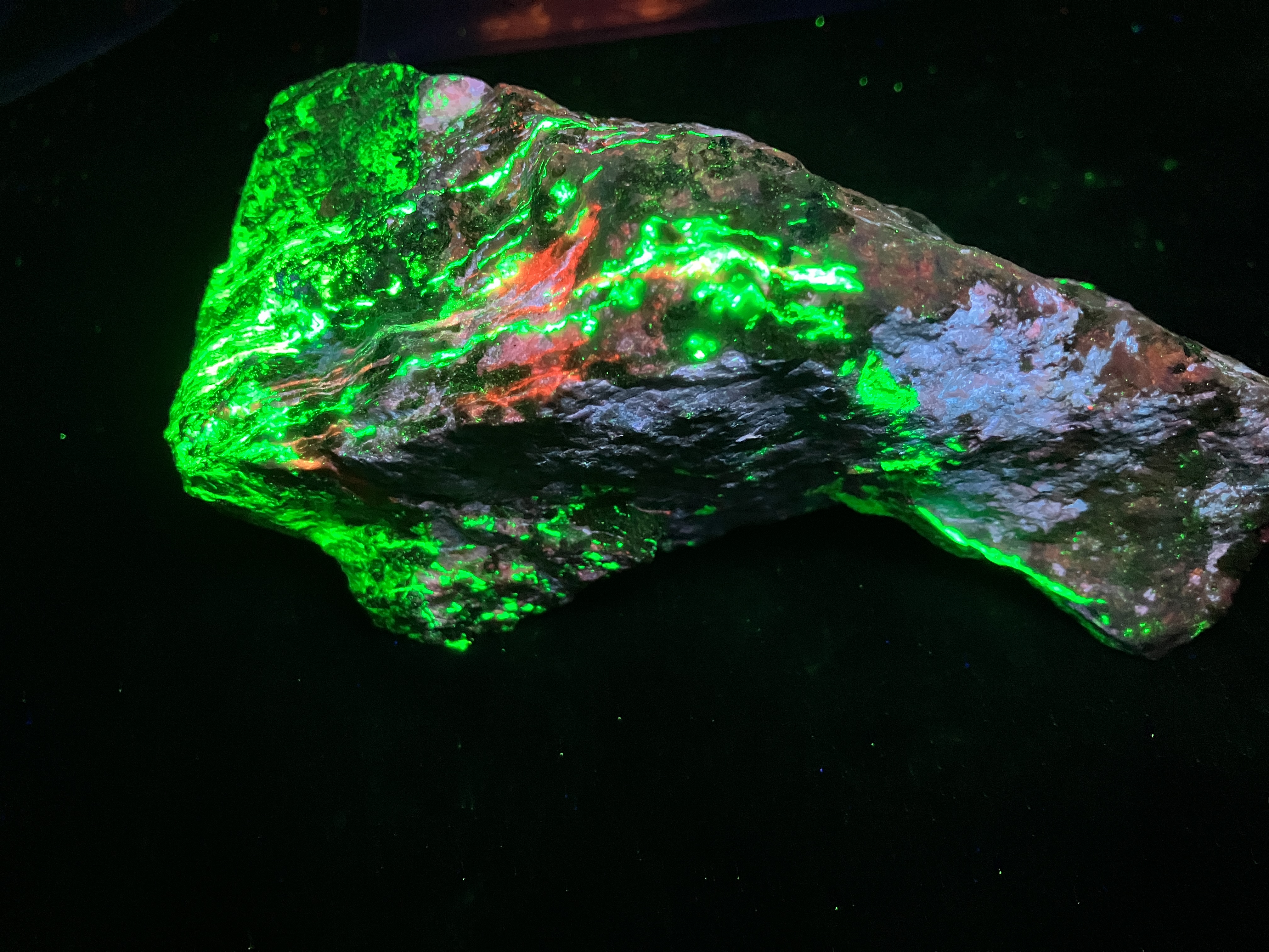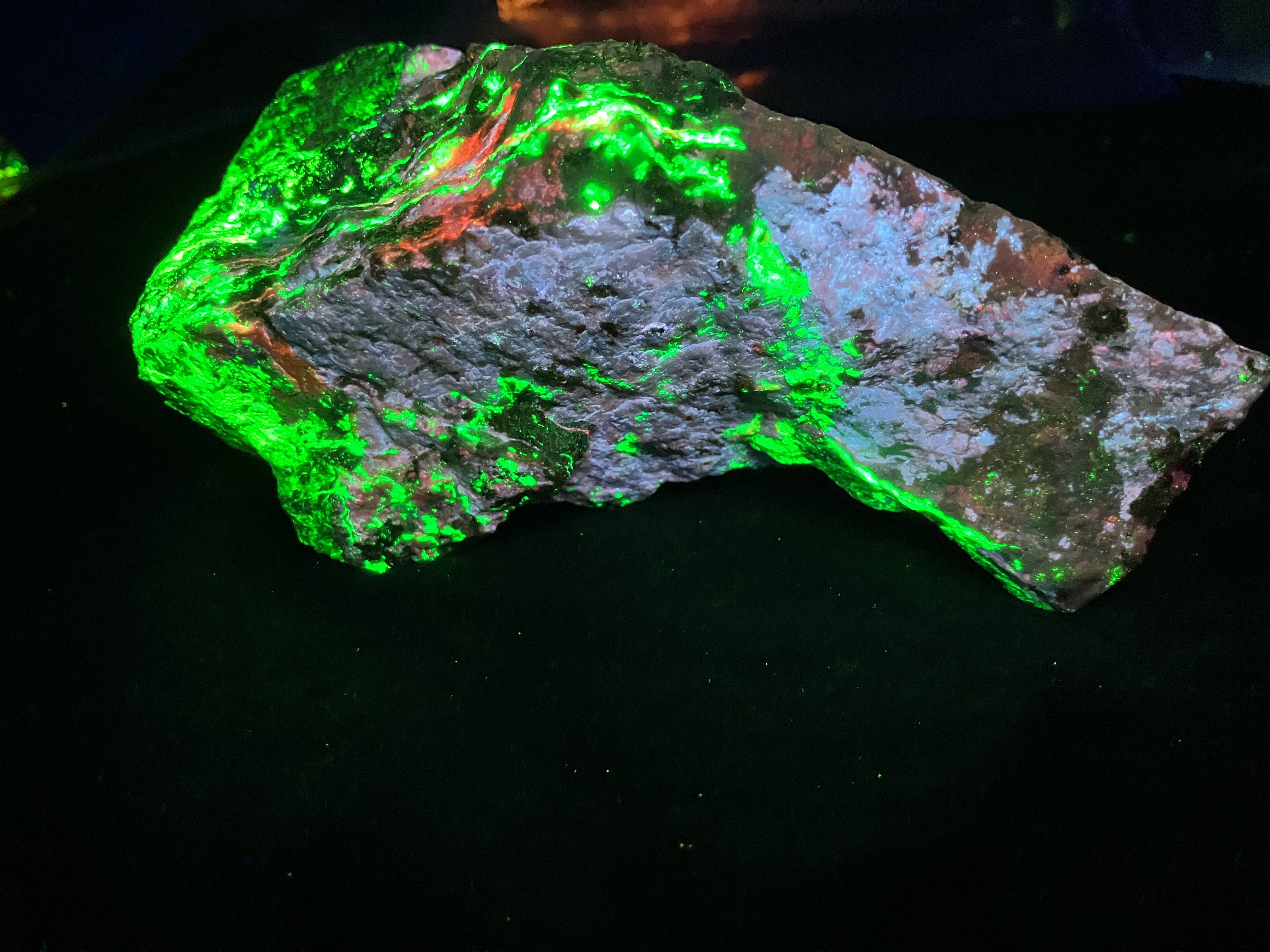 Shortwave UV light: Bright pale blue, often with red zones, less often with white and pink zones Mid wave UV light: Moderately bright red, orange Longwave UV light: Weak red, orange References: Dunn, Pete J. (1995). Franklin and Sterling Hill New Jersey: the world's most magnificent mineral deposits. Franklin, NJ.: The Franklin-Ogdensburg Mineralogical Society. p.499