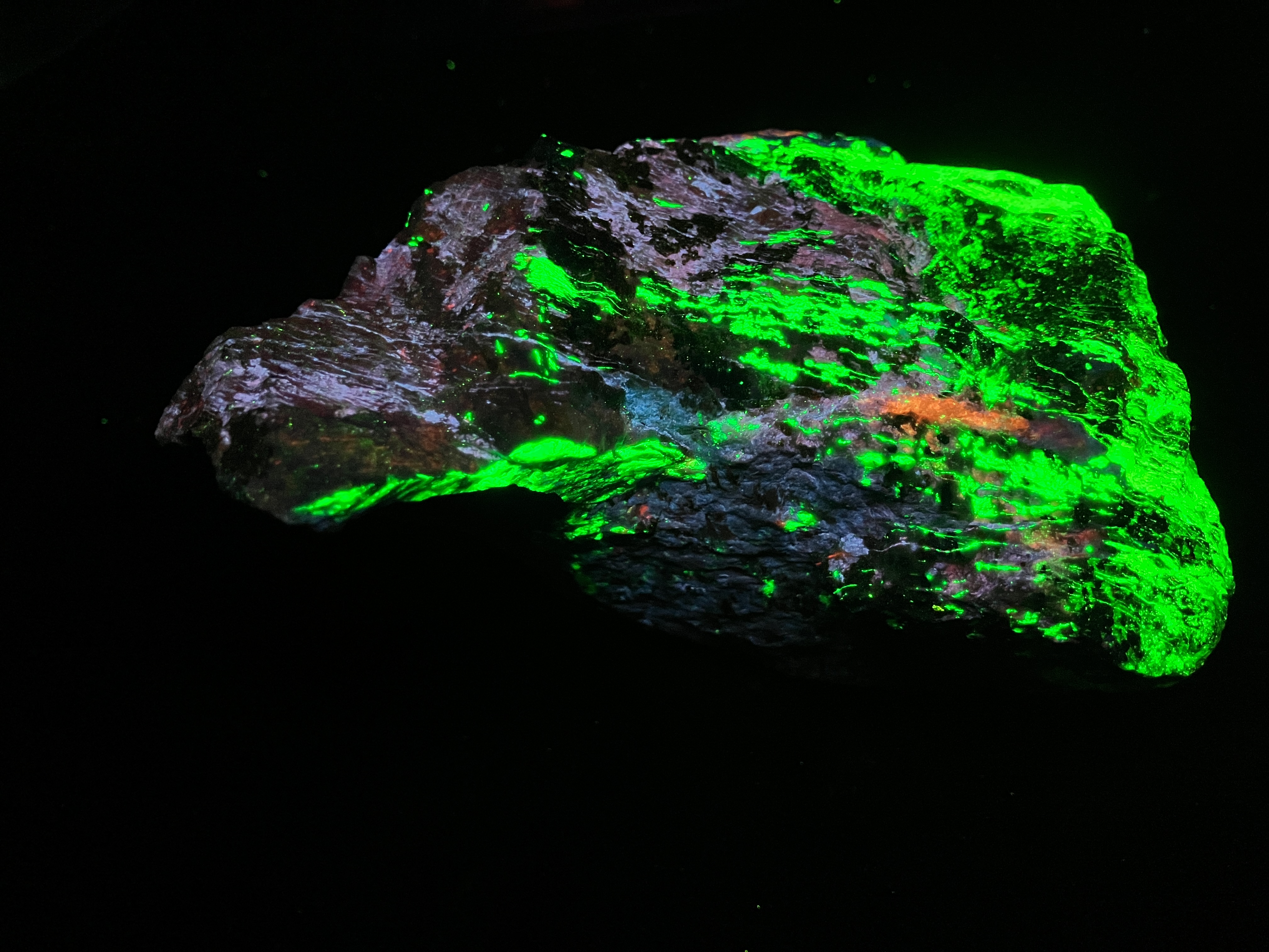 The Furnace mine which was adjacent to the actual furnace, was a 120+ foot vertical shaft just under Franklin Falls. Other rare minerals include esperite, clinohedrite, hardystonite, and others. There are scores of minerals found only here, such as johnbaumite (an arsenous apatite), mcgovernite, etc. Sterling Hill, a very similar zinc orebody, is located a few miles away in Ogdensburg.